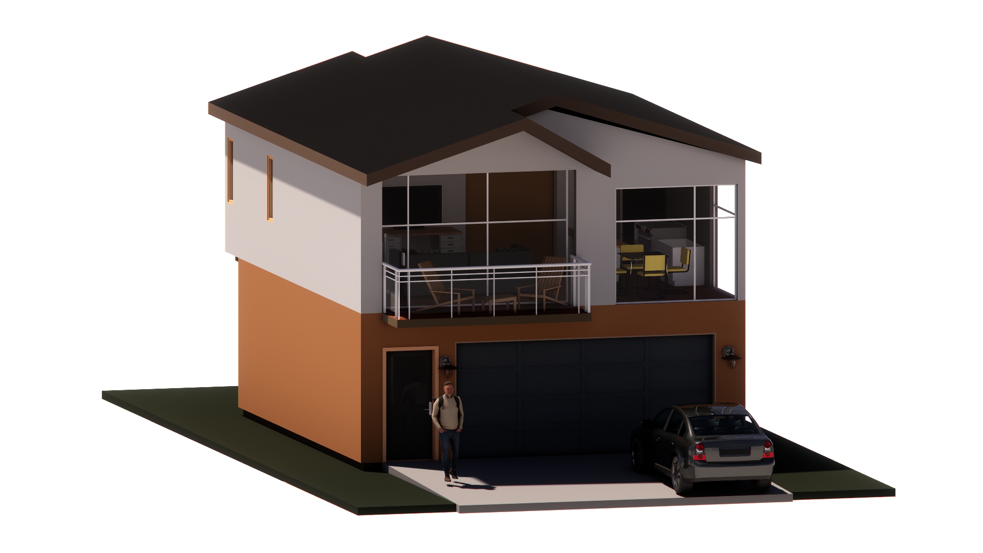 The layout showcases a modern two-story structure with a garage, integrating functional interior spaces with a sleek exterior.